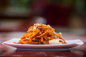 (NO la tradicional hamburguesa con queso, esa es tu opción, camarones molidos con un toque de ajo, jengibre, eneldo y morroño rojo, acompañada de aros de cebolla o papas a la francesa)